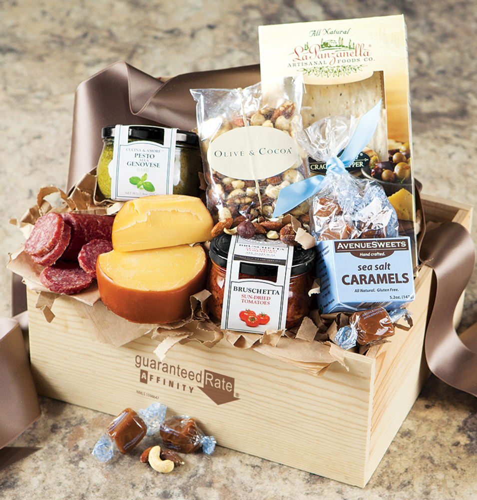 Indulge in the fresh flavors of Italy. Medium includes gourmet collection of farmhouse cheese, rustic crackers, salami, basil pesto, bruschetta spread, mixed nuts, and handmade sea salt caramels. Large adds water crackers, savory flavored cheese, red wine salami, pecan caramels, and extra mixed nuts. Each size arrives gift wrapped in a hand crafted wood crate with ribbon.