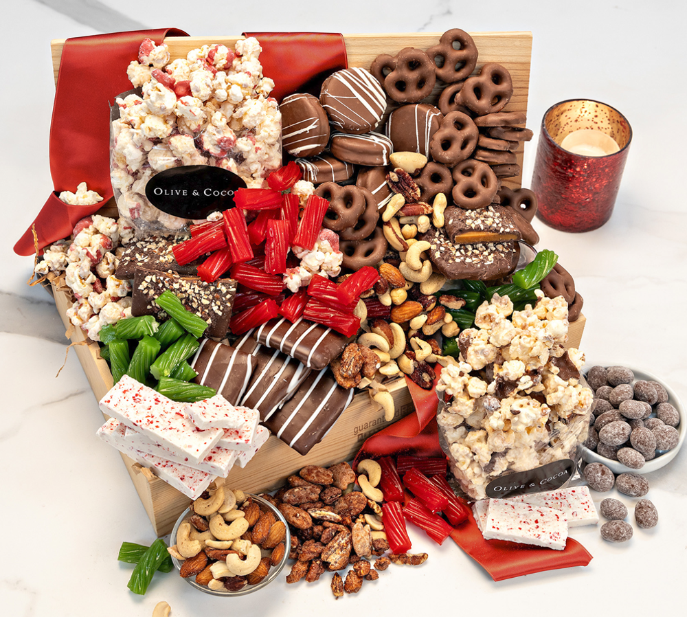 A collection of all-time favorites gift wrapped in a hand crafted wood crate with ribbon. Petite includes rocky road popcorn, white chocolate peppermint bark, milk chocolate pretzels, mixed nuts, and red Aussie licorice. Medium adds white chocolate peppermint popcorn, chocolate covered toffee squares, and dusted toffee almonds. Large adds an extra bag of rocky road popcorn, chocolate and peppermint candy covered sandwich cookies and graham crackers, sweet toasted pecans, and green Aussie licorice. Extra large adds an extra bag each of peppermint popcorn, white chocolate peppermint bark, toffee squares, green and red Aussie licorice, mixed nuts, and milk chocolate pretzels.