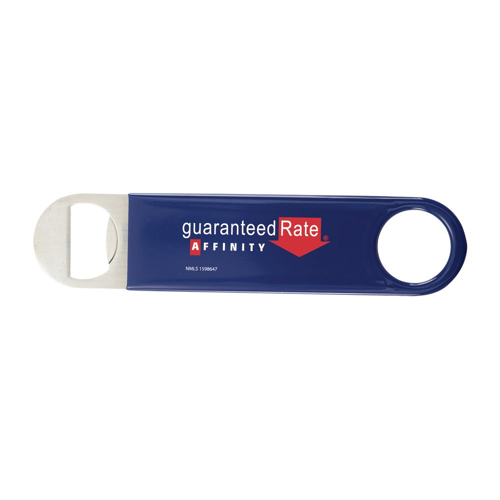 This pub style paddle bottle opener is made of stainless for handling tough to open bottles, a vinyl sleeve to prevent slippage when wet, and a convenient hole at the end allowing for hanging.