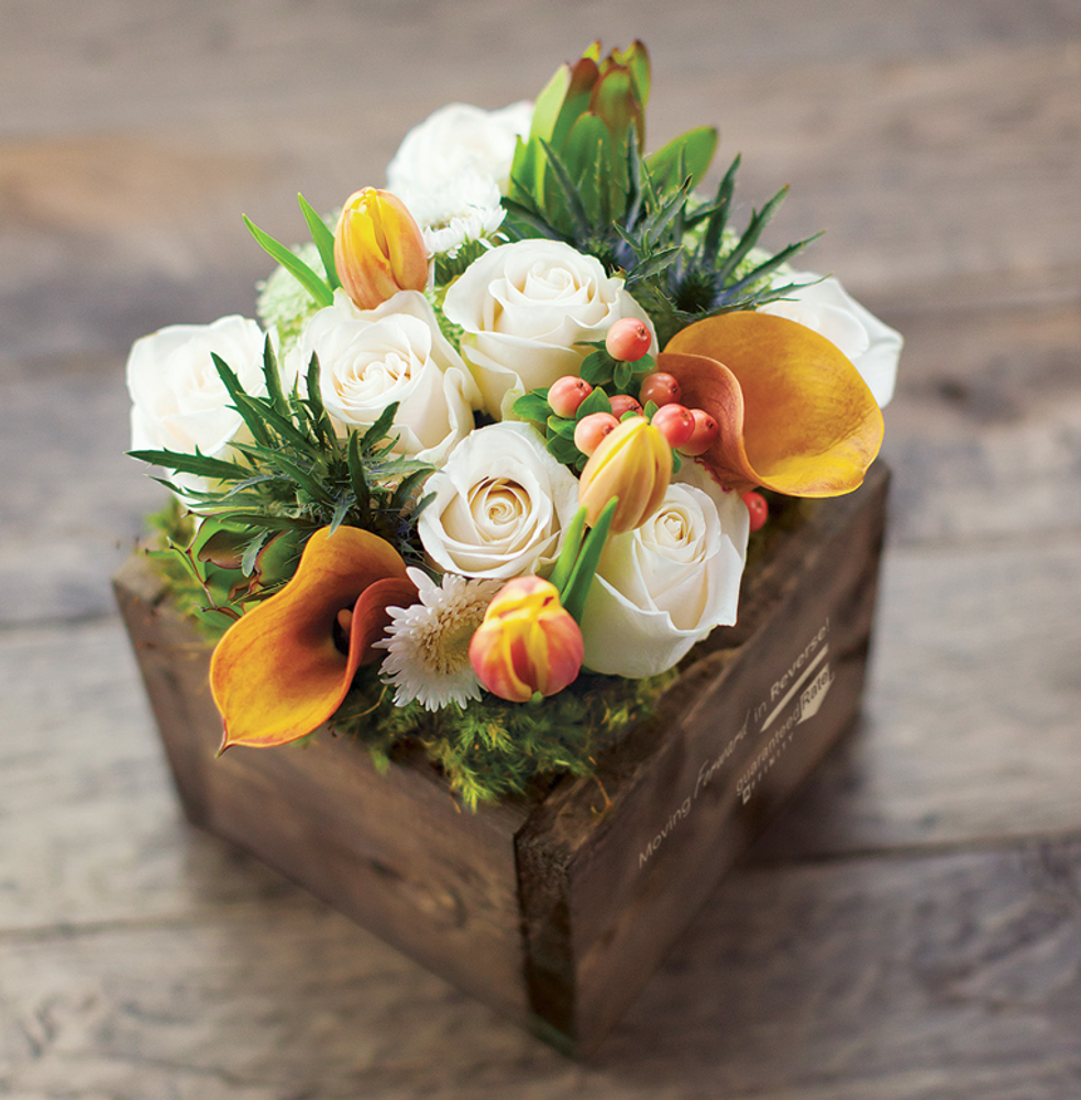 Blossoms of white flourish in a garden of verdant green botanicals with a touch of sunny tangerine. Expertly arranged in a dark-stained handcrafted wood box, Fiore Bianco measures approximately 7" x 7" x 9" to the top of the arrangement and requires next-day shipping.